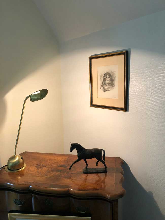 Das Bild zeigt das Chiemseeufer in Arlaching in einer Abendstimmung/ späterer Nachmittag 1946, also im ersten Nachkriegsjahr. HBL und ihr Mann, der im Krieg gedient hatte, betrieben aus Existenzgründen die Landwirtschaft am Thomahof, den die Eltern von HBL 1932 erwoben hatten. Das Bild verdeutlicht in seiner Stimmung unter anderem auch die schwierigen Lebensumstände und die Mangelsituation 1946. Diese verbindet sich mit den bescheidenen Malmitteln und einem besonderen Licht am See zu einer besonderen Komposition. HBL hat sich trotz der schwierigen Arbeit auf dem Land, der Geburt ihres zweiten Kindes Stefan, ihrer eigentlichen Passion, dem Malen gewidmet. Das Bild ist Sinnbild für die Leidenschaft einer jungen Malerin, die sich in einer differenzierten Gefühlswelt mit der Einzigartigkeit der Landschaft verbindet